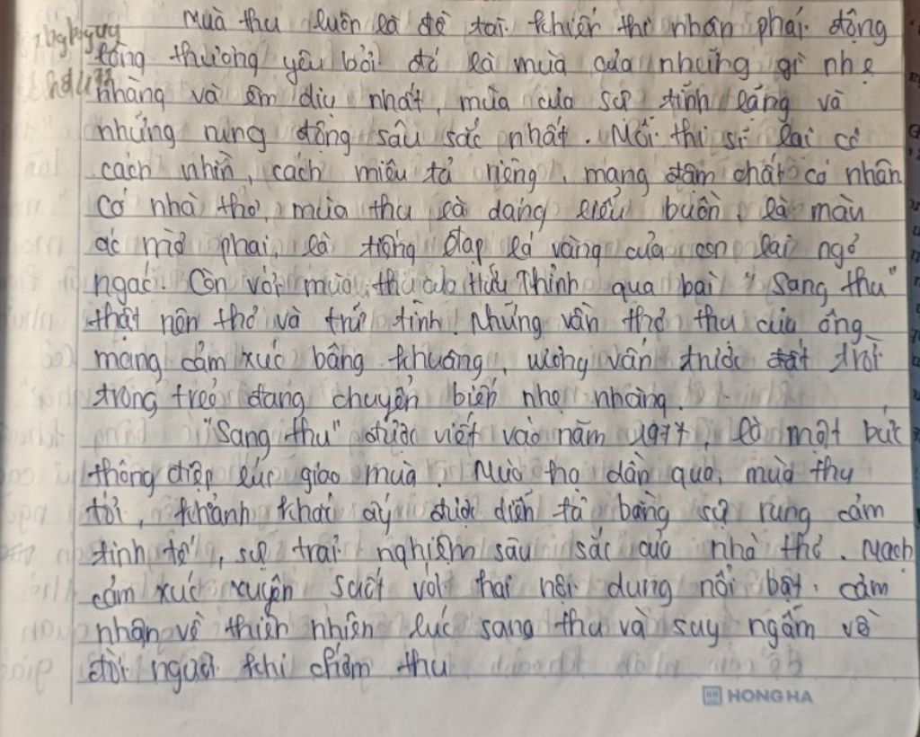 Chớm thu, cơn gió đầu mùa se lạnh thường gợi cảm giác bâng khuâng với tâm hồn tinh tế, nhạy cảm, thi nhân thường tìm đến với mùa thu để tâm tình, bầu bạn. Trong số rất nhiều những tâm tình của thi nhân với mùa thu ấy ta bắt gặp Sang thu của Hữu Thỉnh. Một khoảnh khắc kì diệu, mơ hồ, mong manh của phút giao mùa đã được Hữu Thỉnh “vĩnh cửu” hóa bằng những câu thơ giàu hình ảnh và cảm xúc. Và đoạn thơ tuyệt hay diễn tả cái phút ngưng kì diệu đó là: