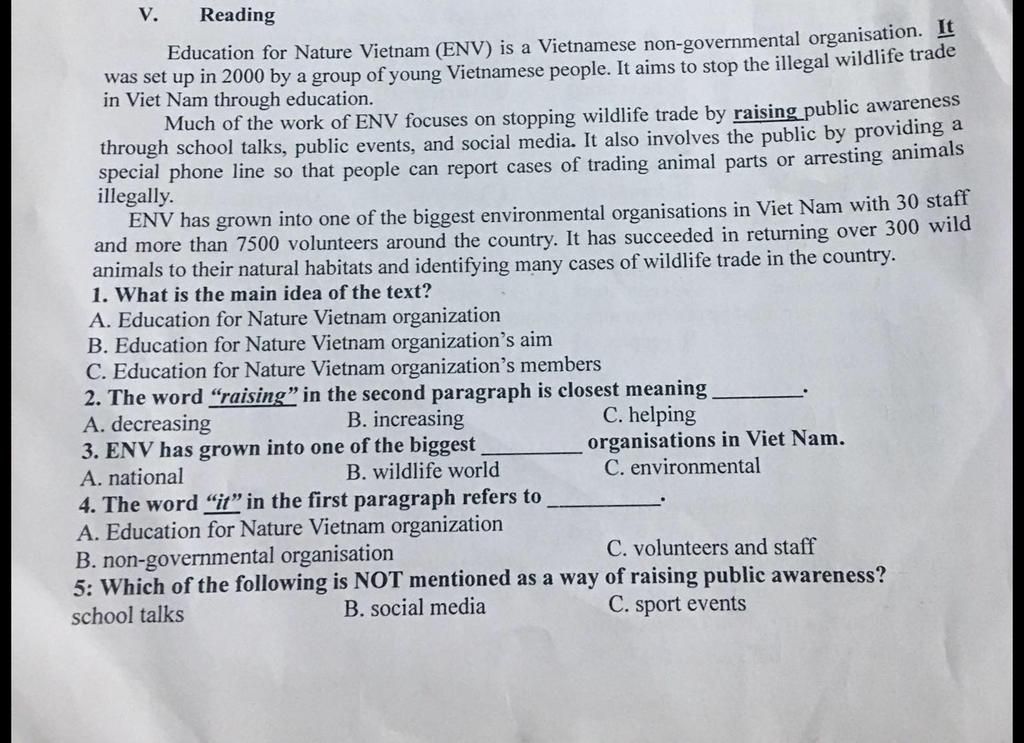 `-` Dẫn chứng: Education for Nature Vietnam (ENV) is a Vietnamese non-governmental organisation. It was set up in 2000 by a group of young Vietnamese people.
