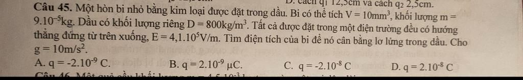 \(q = \dfrac{F}{E} = - \dfrac{{{{8.10}^{ - 4}}}}{{4,{{1.10}^5}}} = - {2.10^{ - 9}}C\)