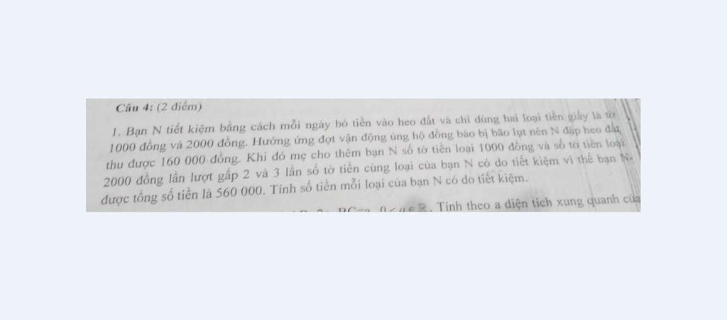 thu được 160.000 đồng. Khi đó mẹ cho thêm bạn N số tờ tiền loại 1000 đồng và số tờ ...