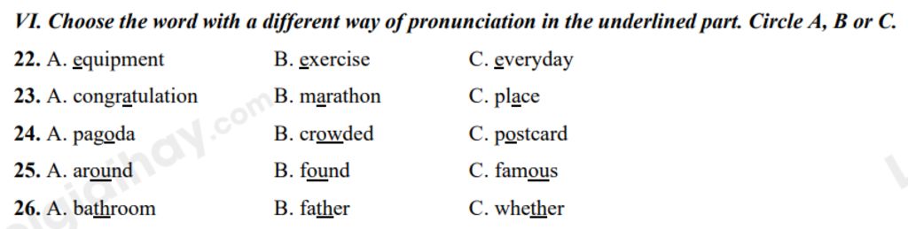 `25`. `B` ( `B` phát âm /aʊ/, còn lại phát âm /ə/)
