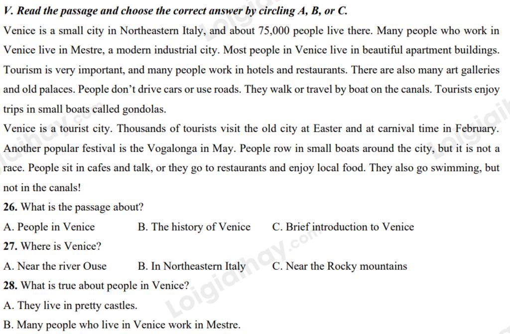 Venice is a small city in Northeastern Italy, and about 75,000 people live there. Many people who work in Venice live in Mestre, a modern industrial city. Most people in Venice live in beautiful apartment buildings. Tourism is very important, and many people work in hotels and restaurants. There are also many art galleries and old palaces. People don’t drive cars or use roads. They walk or travel by boat on the canals. Tourists enjoy trips in small boats called gondolas.