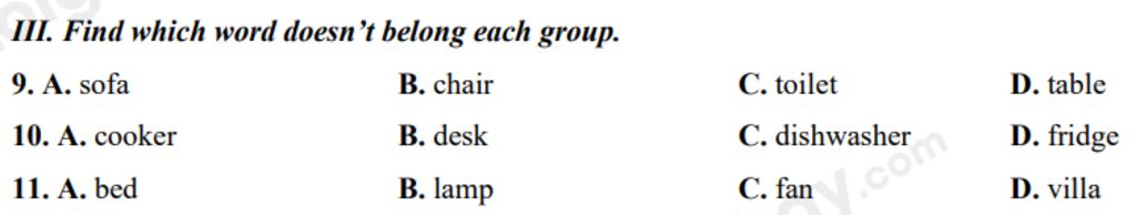 `11` D (là loại nhà, còn lại là dụng cụ trong nhà)