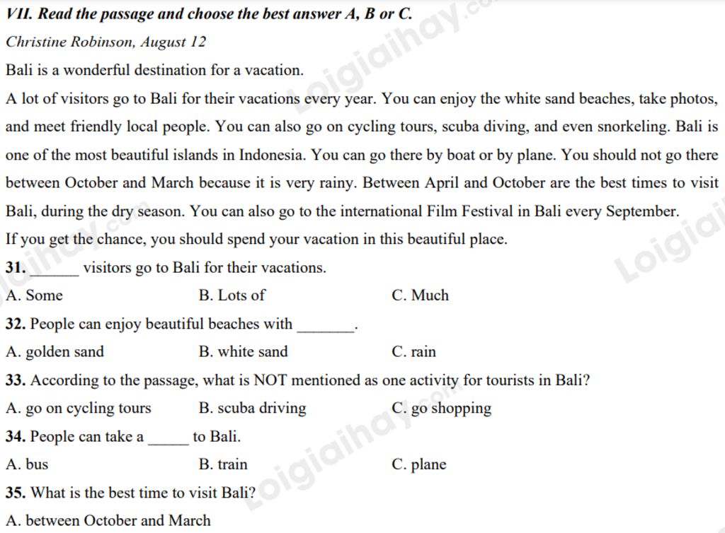 B. Lots of `→` Bài đọc nói rằng "A lot of visitors go to Bali..." nghĩa là rất nhiều du khách đến đây