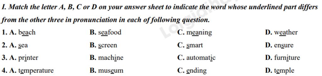 `1.D` phát âm /e/, còn lại được phát âm /iː/