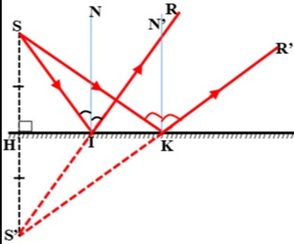 + Kéo dài hai tia phản xạ IR và KR’ gặp nhau ở đúng điểm S’ mà ta đã vẽ trong cách a.