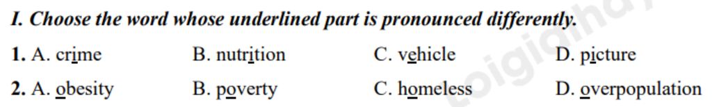 I. Choose the word whose underlined part is pronounced differently. 1. A. crime B. nutrition C. vehicle D. picture 2. A. obesity B. poverty C. homeless D. overpopulation