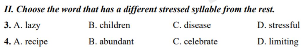 II. Choose the word that has a different stressed syllable from the rest. 3. A. lazy B. children C. disease D. stressful 4. A. recipe B. abundant C. celebrate D. limiting