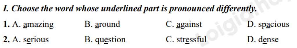 I. Choose the word whose underlined part is pronounced differently. 1. A. amazing B. around C. against D. spacious 2. A. serious B. question C. stressful D. dense