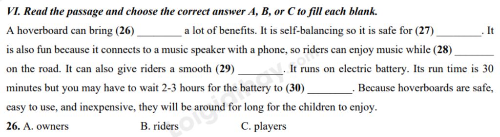 A hoverboard can bring (26) ________ a lot of benefits. It is self-balancing so it is safe for (27) ________. It is also fun because it connects to a music speaker with a phone, so riders can enjoy music while (28) _______ on the road. It can also give riders a smooth (29) ________. It runs on electric battery. Its run time is 30 minutes but you may have to wait 2-3 hours for the battery to (30) ________. Because hoverboards are safe, easy to use, and inexpensive, they will be around for long for the children to enjoy.