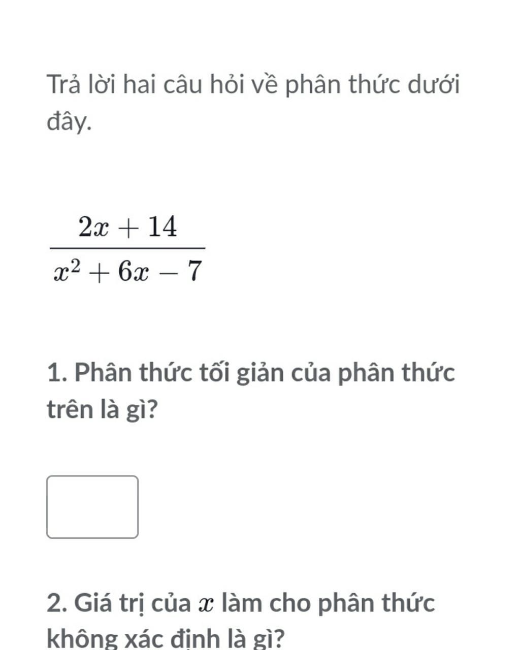 `2,` Để phân thức `(2x +14)/(x^2 + 6x - 7)` không được xác định thì