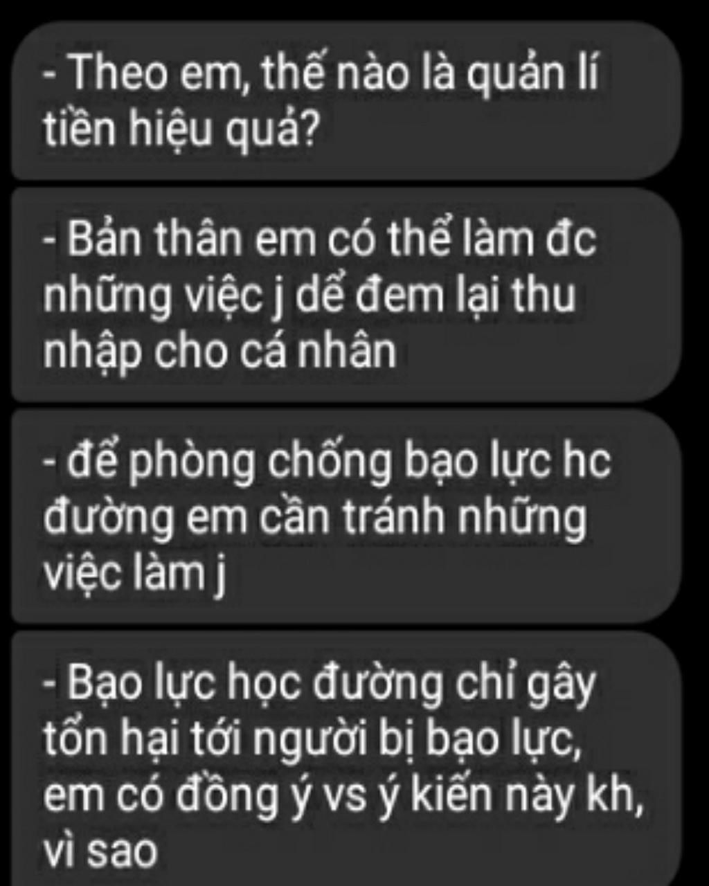 `-` Bạo lực học đường chỉ gây tổn hại đến người bị báo lực.Em chưa đồng ý với ý kiến này :