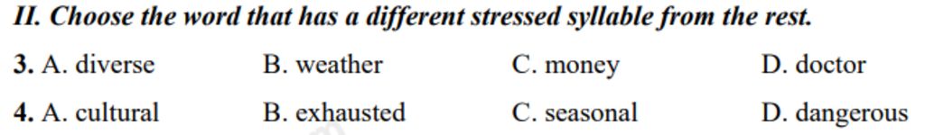 II. Choose the word that has a different stressed syllable from the rest.