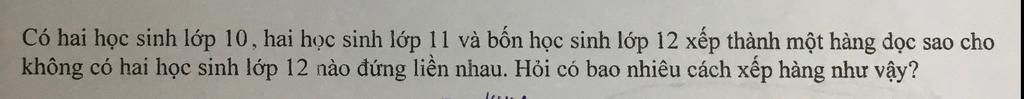 Để 4 học sinh lớp 12 không có 2 học sinh lớp 12 nào đứng liền nhau thì 4 học sinh lớp 12 sẽ được đứng xen kẽ giữa các học sinh lớp 10 và lớp 11.