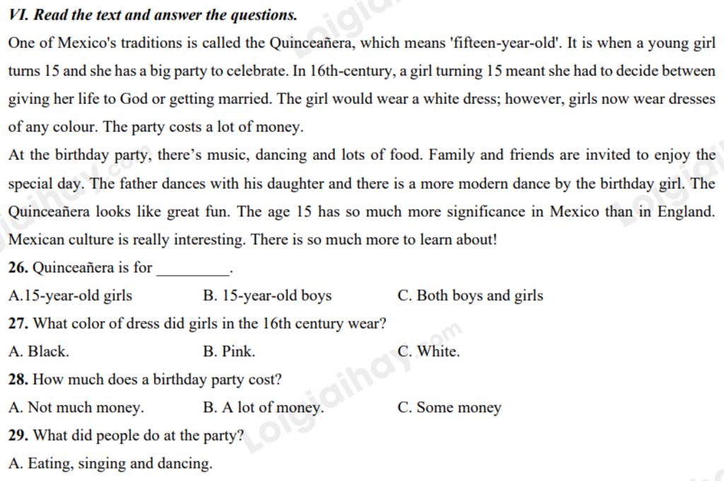 `-` Dẫn chứng: One of Mexico's traditions is called the Quinceañera, which means 'fifteen-year-old'. It is when a young girl turns 15 and she has a big party to celebrate.