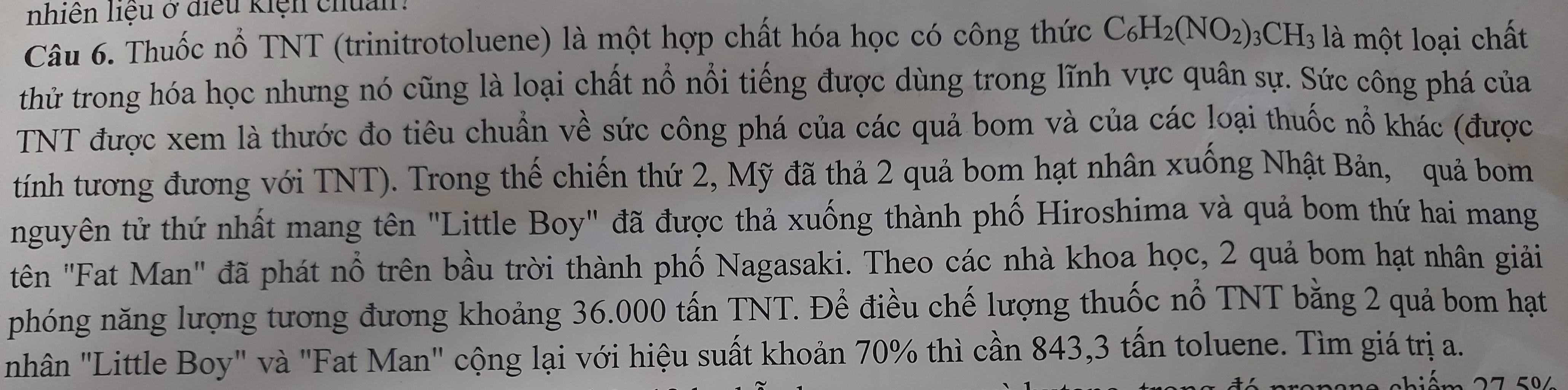 Câu 6. Thuốc nổ TNT (trinitrotoluene) là một hợp chất hóa học có công thức C6Hz(NO2)3CH3 là một loại chất