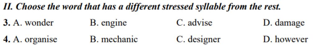 `-` Câu `B` `C` `D` trọng âm `2` , câu `A` trọng âm `1` .