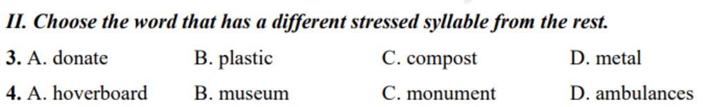 `-` Câu `A` `C` `D` trọng âm `1` , câu `B` trọng âm `2` .