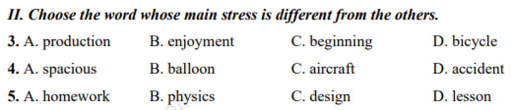 `-` Câu `A` `C` `D` trọng âm `1` , câu `B` trọng âm `2` .