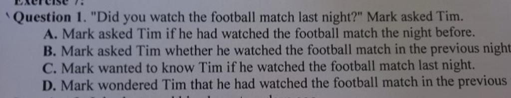 `-` Dịch : Mark asked Tim if he had watched the football match the night before .