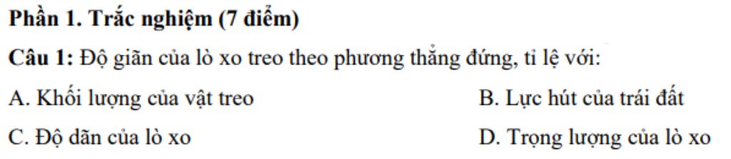 `→` Độ giãn của lò xo treo theo phương thẳng đứng, tỉ lệ với Khối lượng của vật treo.