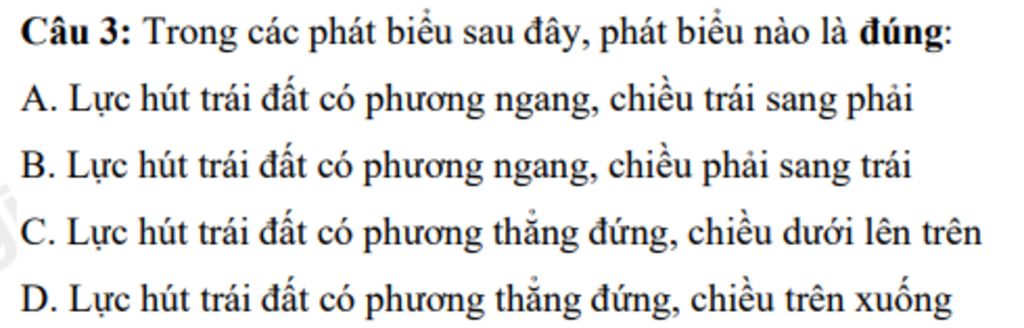 `D` Lực hút trái đất có phương thẳng đứng, chiều trên xuống