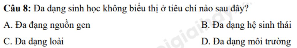 `->` Độ đa dạng sinh học được thể hiện qua đa dạng loài, đa dạng môi trường sống và đa dạng hệ sinh thái.