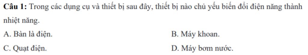 `->` Trong các dụng cụ và thiết bị sau đây, thiết bị chủ yếu biến đổi điện năng thành nhiệt năng là bàn là điện.