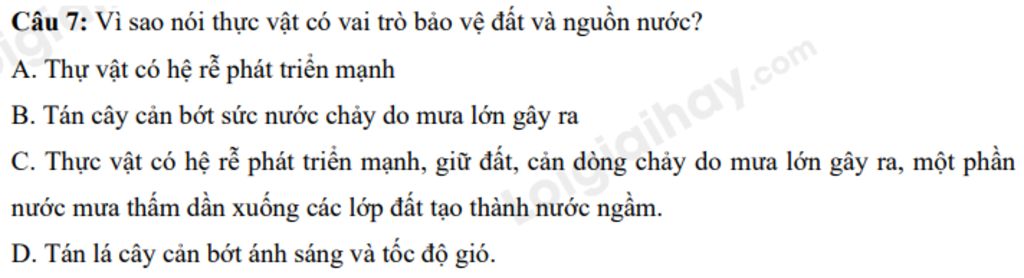 `->` Thực vật có vai trò bảo vệ đất và nguồn nước vì thực vật có hệ rễ phát triển mạnh, giữ đất, cản dòng chảy do mưa lớn gây ra, một phần nước mưa thấm dần xuống các lớp đất tạo thành nước ngầm