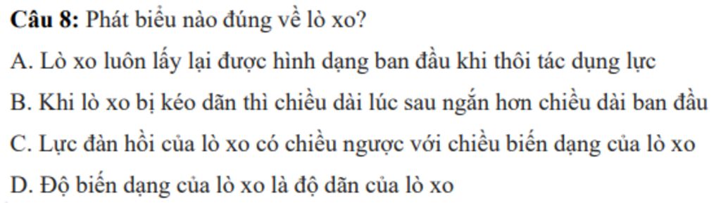 Câu 8: Phát biểu nào đúng về lò xo?