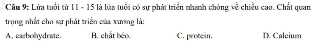 Câu 9: Lứa tuổi từ 11 - 15 là lứa tuổi có sự phát triển nhanh chóng về chiều cao. Chất quan trọng nhất cho sự phát triển của xương là: