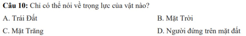 `@`Trọng lực là lực hút của Trái Đất lên các vật đặt xung quanh Trái Đất nên chỉ có thể nói về trọng lực của người trên mặt đất