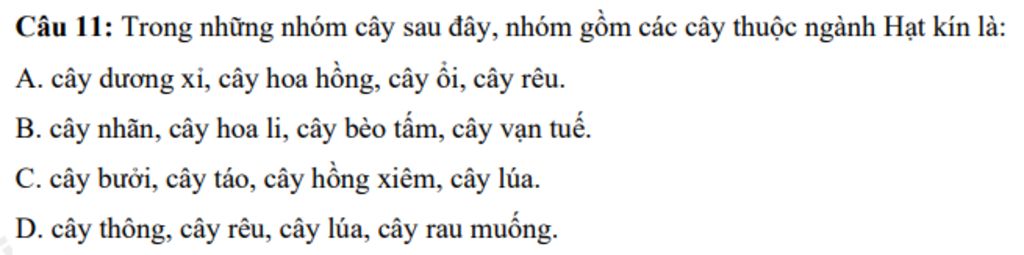 Câu `11`: Trong những nhóm cây sau đây, nhóm gồm các cây thuộc ngành Hạt kín là: