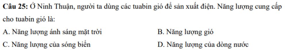 `@`Tại tỉnh Ninh Thuận, người ta sử dụng các tuabin gió hoạt động để sản xuất điện. Năng lượng cung cấp cho tuabin gió là năng lượng của gió sử dụng sức gió để quay cánh quạt và chuyển động các động cơ tạo ra điện năng