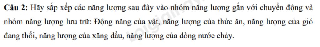 - Nhóm năng lượng gắn với chuyển động: Động năng của vật; năng lượng của gió đang thổi năng lượng của dòng nước chảy.