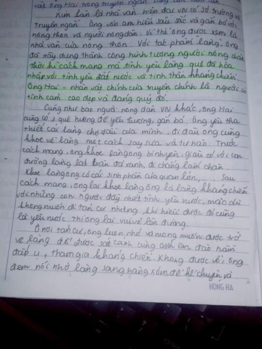Tác giả Kim Lân thật tài tình khi đặt nhân vật của mình trong một tình huống éo le, nhưng vì có tình huống đó đã làm nổi bật lên nhân vật ông Hai với một tình yêu làng, yêu nước mãnh kiệt như thế nào. Một người nông dân điển hỉnh nhất trong thời kì kháng chiến chống Pháp. Qua tác phẩm ta còn thấy được lòng yêu nước nồng nàn của Kim Lân. Đồng thời, thể hiện tình yêu thương đối với những người nhân dân chất phác, đôn hậu, thật thà của nhân dân ta.