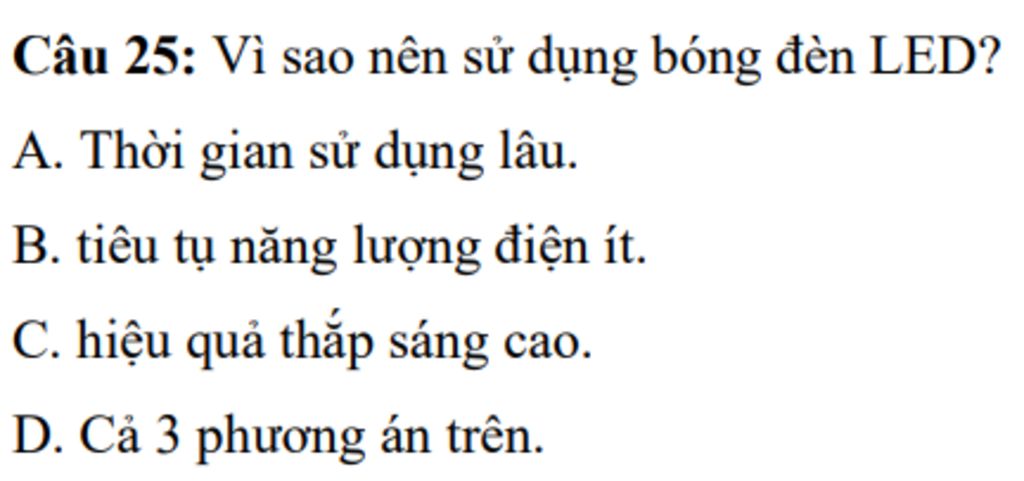 Câu `25` : Vì sao nên sử dụng bóng đèn `LED?`
