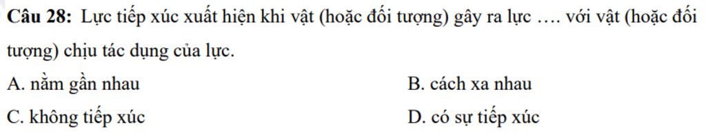 Câu `28` : Lực tiếp xúc xuất hiện khi vật (hoặc đối tượng) gây ra lực . với vật (hoặc đối tượng) chịu tác dụng của lực. ....