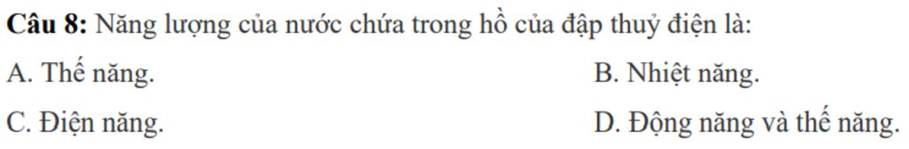 Giải thích các bước giải: Nước chứa trong hồ của đập thủy điện đổ xuống mạnh mẽ (động năng) và thay đổi độ cao từ trên xuống (thế năng)