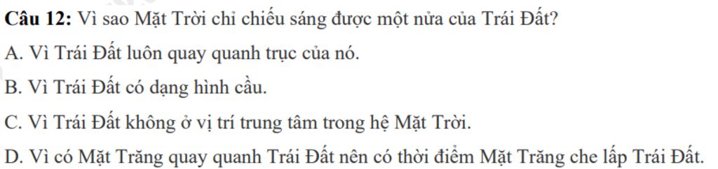 =>vậy đáp án là B. Vì Trái Đất có dạng hình cầu.