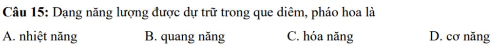 `@`Dạng năng lượng được dự trữ trong que diêm, pháo hoa thường là năng lượng hóa năng, hoá năng được giải phóng khi đốt chấy que diêm, pháo hoa