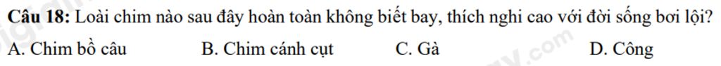`@`Chim cánh cụt hoàn toàn không biết bay, thích nghi cao với đời sống bơi lội vì chim cánh cụt có cơ thể được tạo ra để di chuyển dưới nước hiệu quả, với lông đặc biệt và cánh giúp chúng lướt trên nước và điều hướng dưới nước linh hoạt