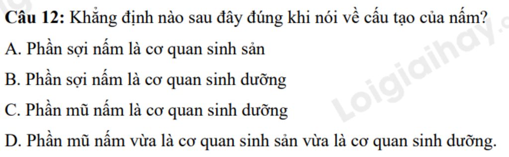 `=>` Chọn `B`. Vì sợi nấm là cơ quan sinh dưỡng, phần mũ nấm là cơ quan sinh sản.