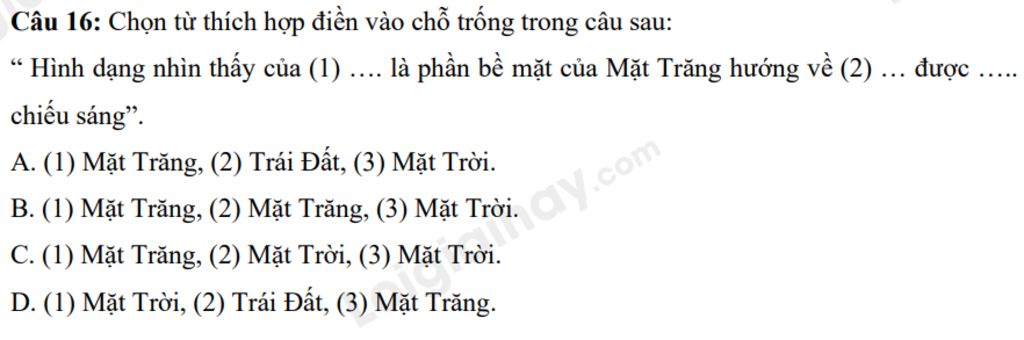 Câu 16: Chọn từ thích hợp điền vào chỗ trống trong câu sau: “Hình dạng nhìn thấy của (1) …. là phần bề mặt của Mặt Trăng hướng về (2) … được ….. chiếu sáng”.