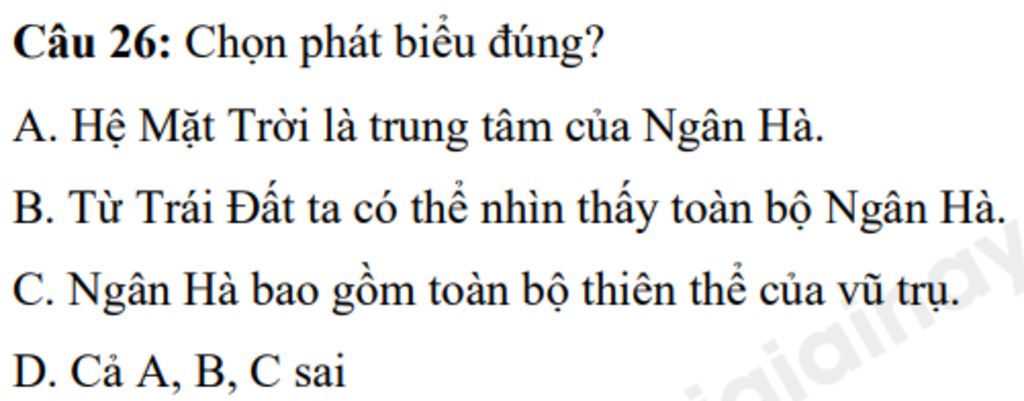 `@` Ngân Hà bao gồm toàn bộ thiên thể của vũ trụ. `->` Sai vì bên trong vũ trụ còn có nhiều Ngân Hà khác, nên không có chuyện Ngân Hà bao gồm toàn bộ thiên thể của vũ trụ.