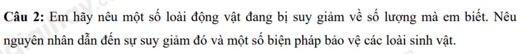 Những loài đang bị suy giảm về số lượng: báo đốm, đười ươi, voi, khỉ đột, cá heo, loài nai Java, hươu đồng lầy Nam Mỹ, tê giác hai sừng, bò xám, heo vòi, cầy rái cá, cá sấu hoa cà, hươu sao Việt, hổ, tê tê, trâu rừng, dê núi, cầy, chồn, khỉ, voọc...