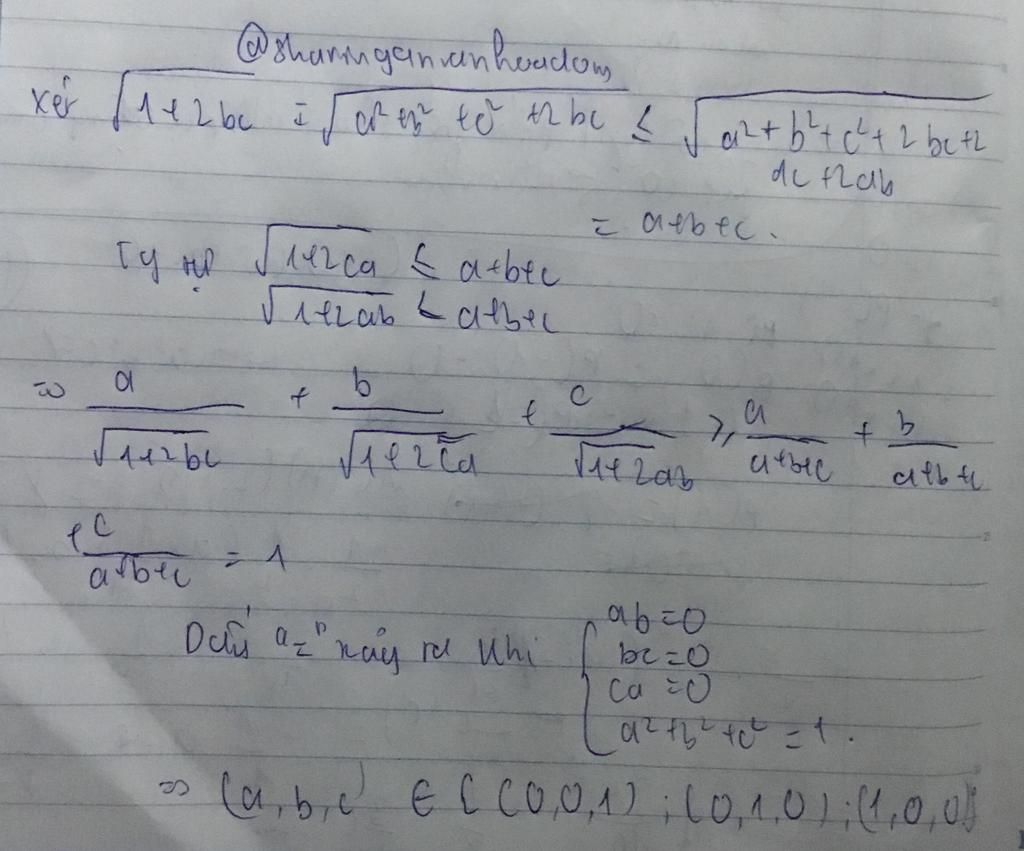 chứng minh rằng: a/ căn 1+2bc + b/ căn 1+2ca + c/ căn 1+2ab lớn hơn hoặc bằng 1