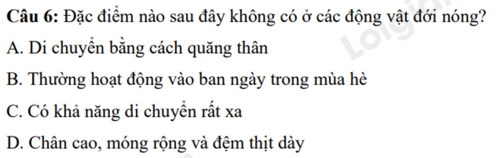 vì Đặc điểm không có ở các động vật đới nóng là: Thường hoạt động vào ban ngày trong mùa hè.