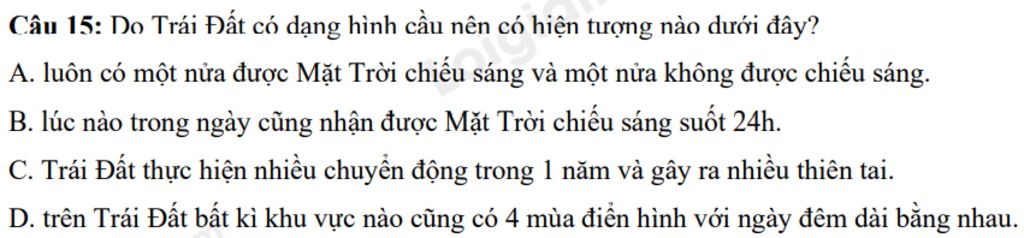 Câu 15: Do Trái Đất có dạng hình cầu nên có hiện tượng nào dưới đây?