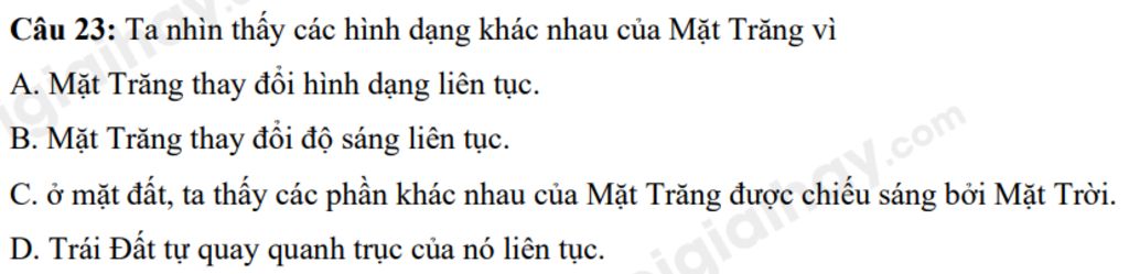 `@`Ta nhìn thấy các hình dạng khác nhau của Mặt Trăng vì ở mặt đất, ta thấy các phần khác nhau của Mặt Trăng được chiếu sáng bởi Mặt Trời vì vậy các phần của Mặt Trăng được chiếu sáng một cách khác nhau, tạo ra các hình Mặt Trăng khác nhau